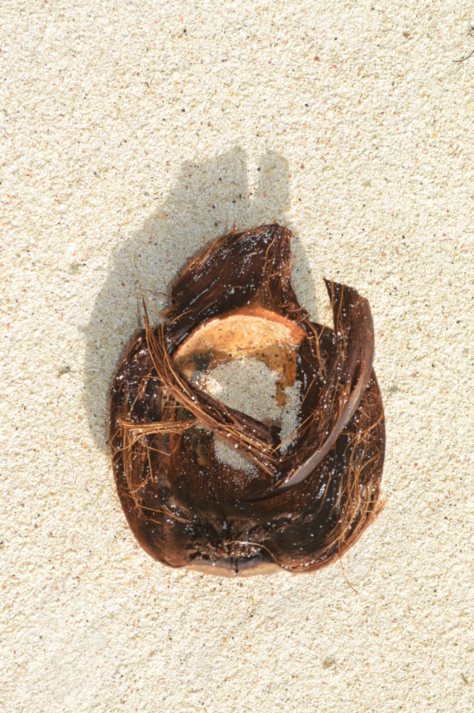The texture of this broken husk is lovely. Its shadow? After a week of diving, I see a moray eel, of course!