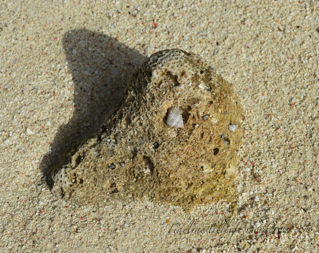 At first glance, just a bit of long-dead coral. I was attracted more to the shadow than I was to the rock. I did notice the larger mollusk in the center when I photographed it. It was alive – I tried to see if I could remove it after taking the photo, and it was nicely suctioned in its place, happily protected by the coral. It was not until I got home that I noticed many, many other tiny mollusks living in the crevasses. Our coral reefs are precious beyond measure. And even long after it has died off, the remains of this coral colony have become a colony again.