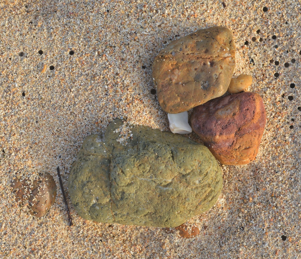 When I took this photo during the summer, I was planning to post it on September 22, the first day of fall. This morning’s foreshadowing of the upcoming change of season caused me to change my mind. The colors of these stones are a perfect harbinger of what is just around the corner. Their placement next to each other was pure serendipity.