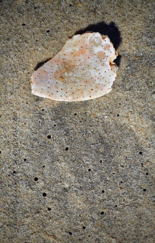 Polka-Dots are in Season Posted on September 30, 2013 by Maggie Beck 2 Love the beach after a storm for all the marine debris that comes in with the tide. This ancient and worm-eaten shell fragment positioned itself perfectly on a field of sand crab airways. Share this: Click to share on X (Opens in new window) X Click to share on Facebook (Opens in new window) Facebook Click to email a link to a friend (Opens in new window) Email Click to share on Pinterest (Opens in new window) Pinterest Like Loading... Related