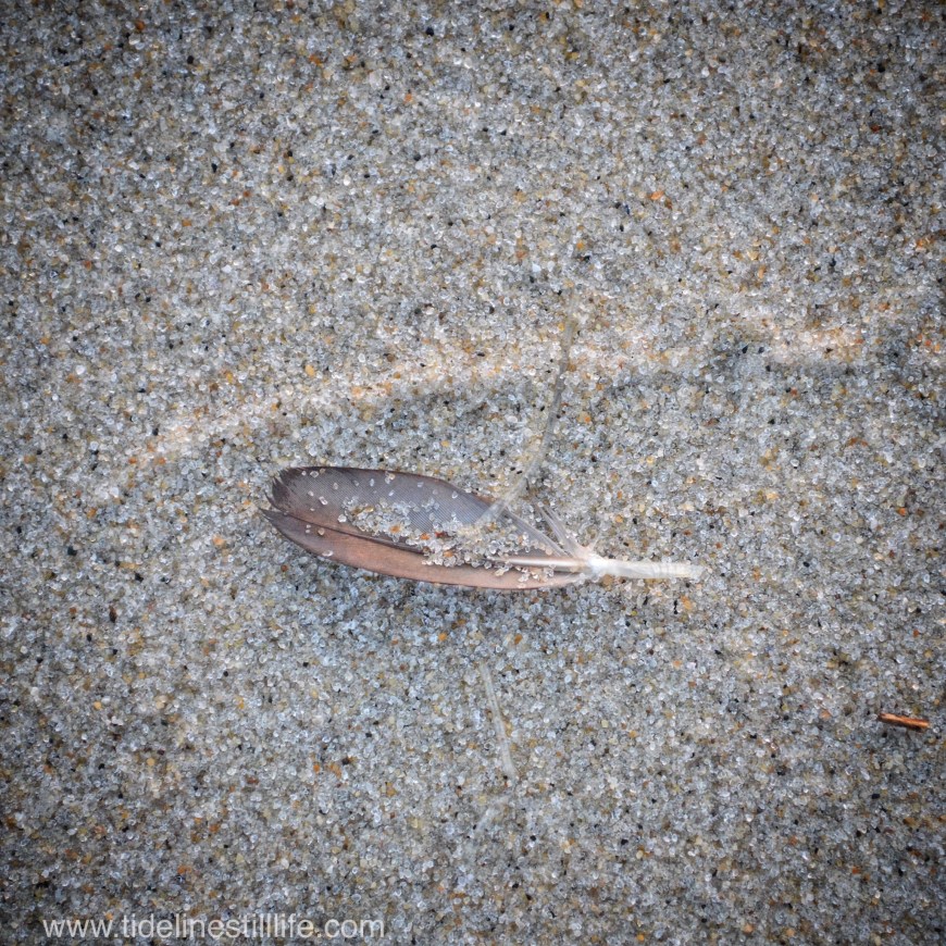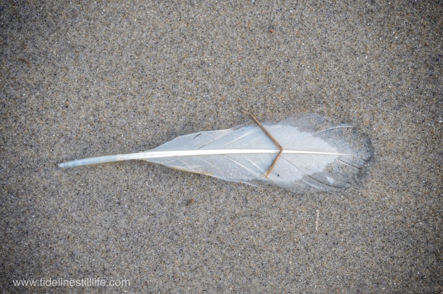 A feather, a reed, and a small bit of marine plant create a simple, but comprehensive still life.