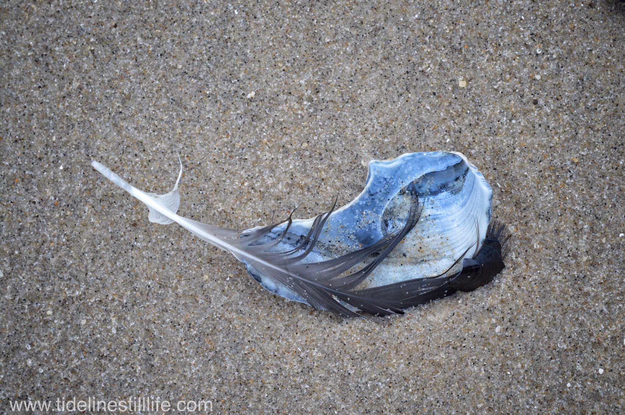Tagged beach, blue, blue and white, feather, mussel, New Jersey, ocean, sand, shell, Spring Lake, still life, tide line, white