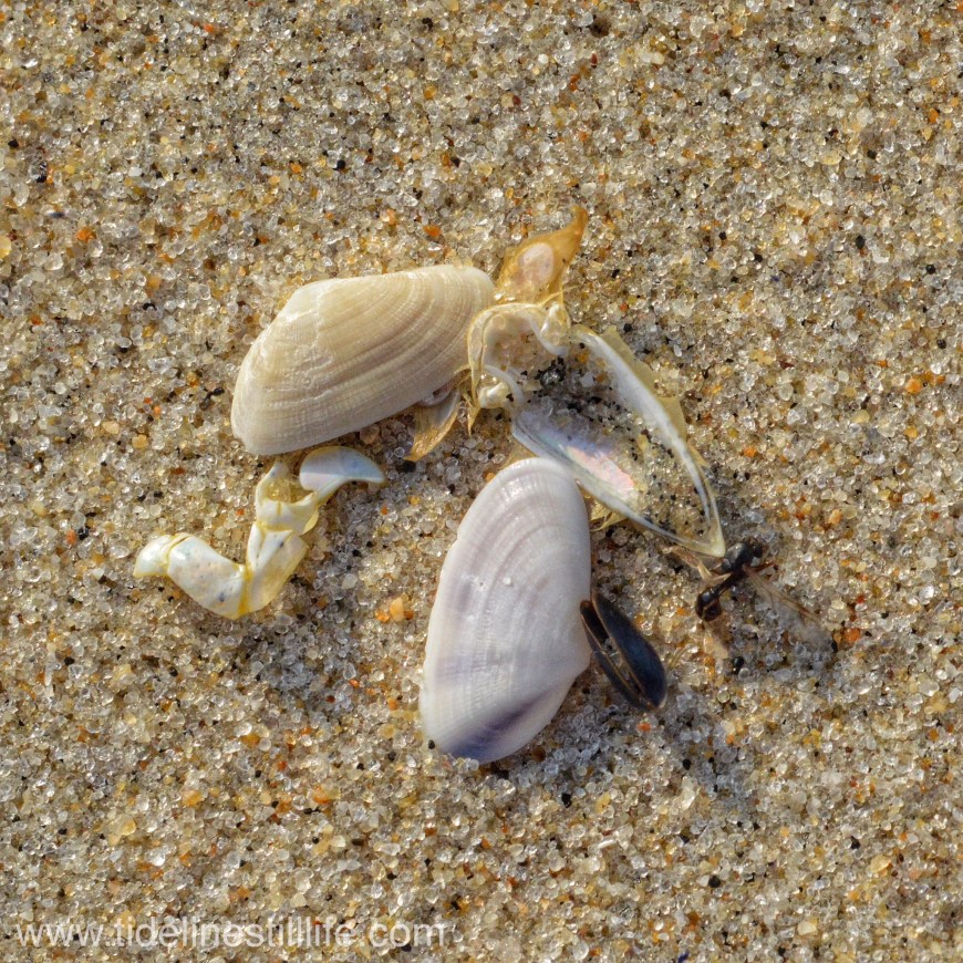 Tagged ant, beach, collection, coquina, crab, insect, jumble, mussel, ocean, sand, still life, tide line