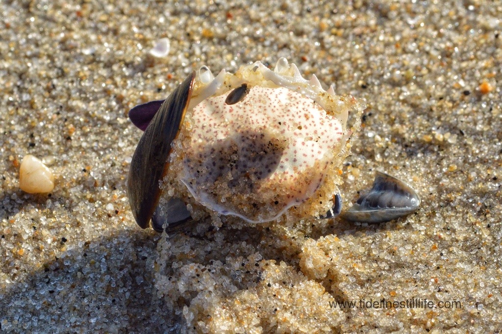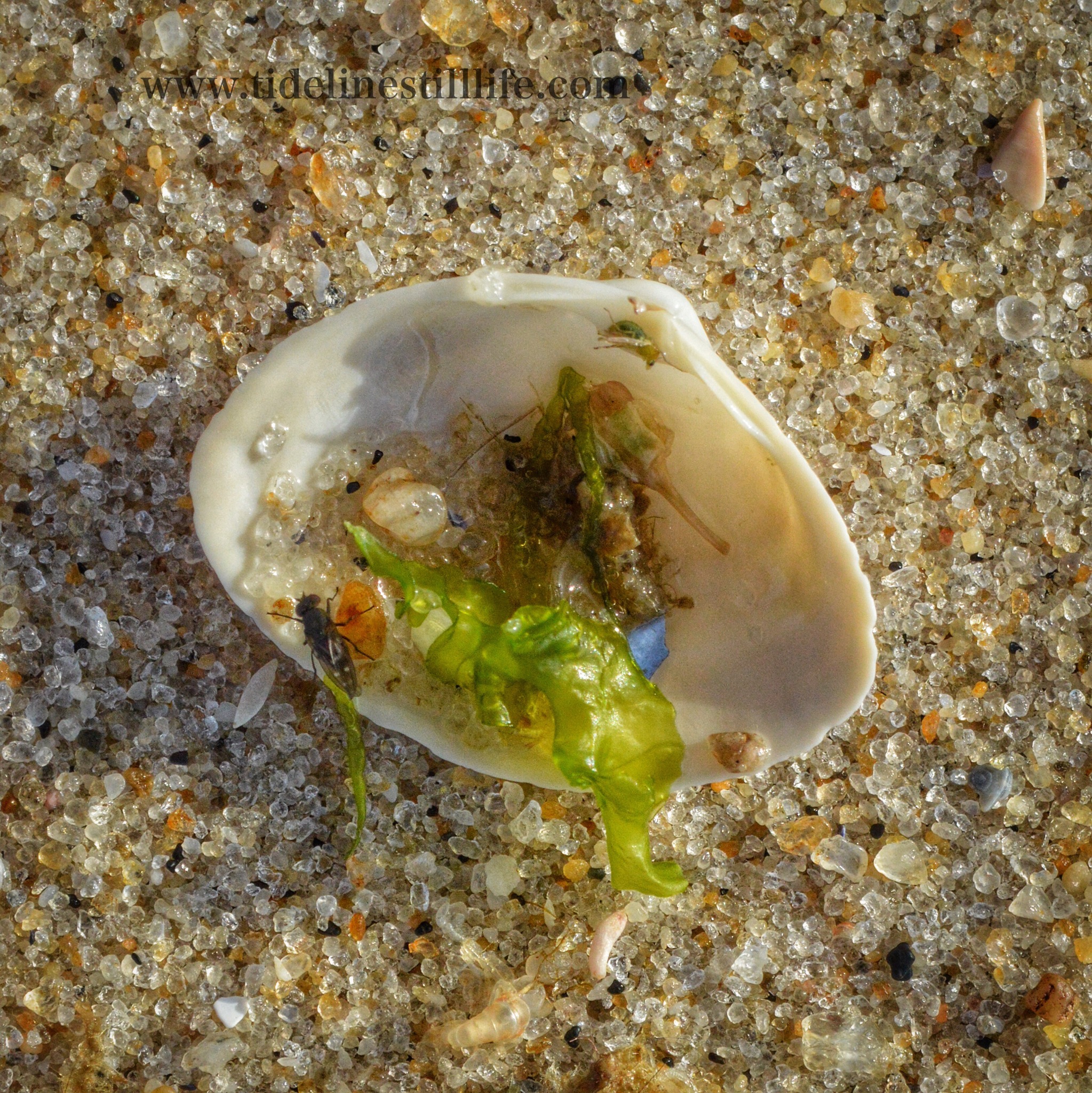 The sun, new in the east, and the strong wind from the west created this still life. The carapace must have been wind-lifted just minutes before, because this arrangement was within the reach of the tide. I was captivated by the glowing light, as well as by the “strings” of sand that are remnants of the creature that once lived within this translucent shell.