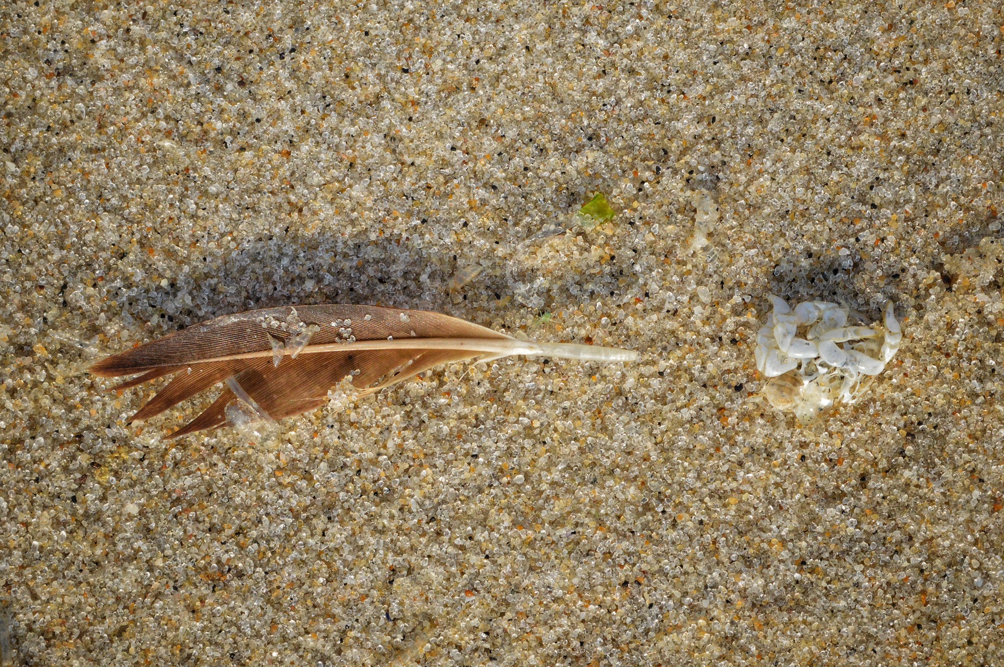 Well into the dunes, this horseshoe crab carapace was settled in beautifully beside the dried reed. I like how the reed echoes the points and angles of the carapace.