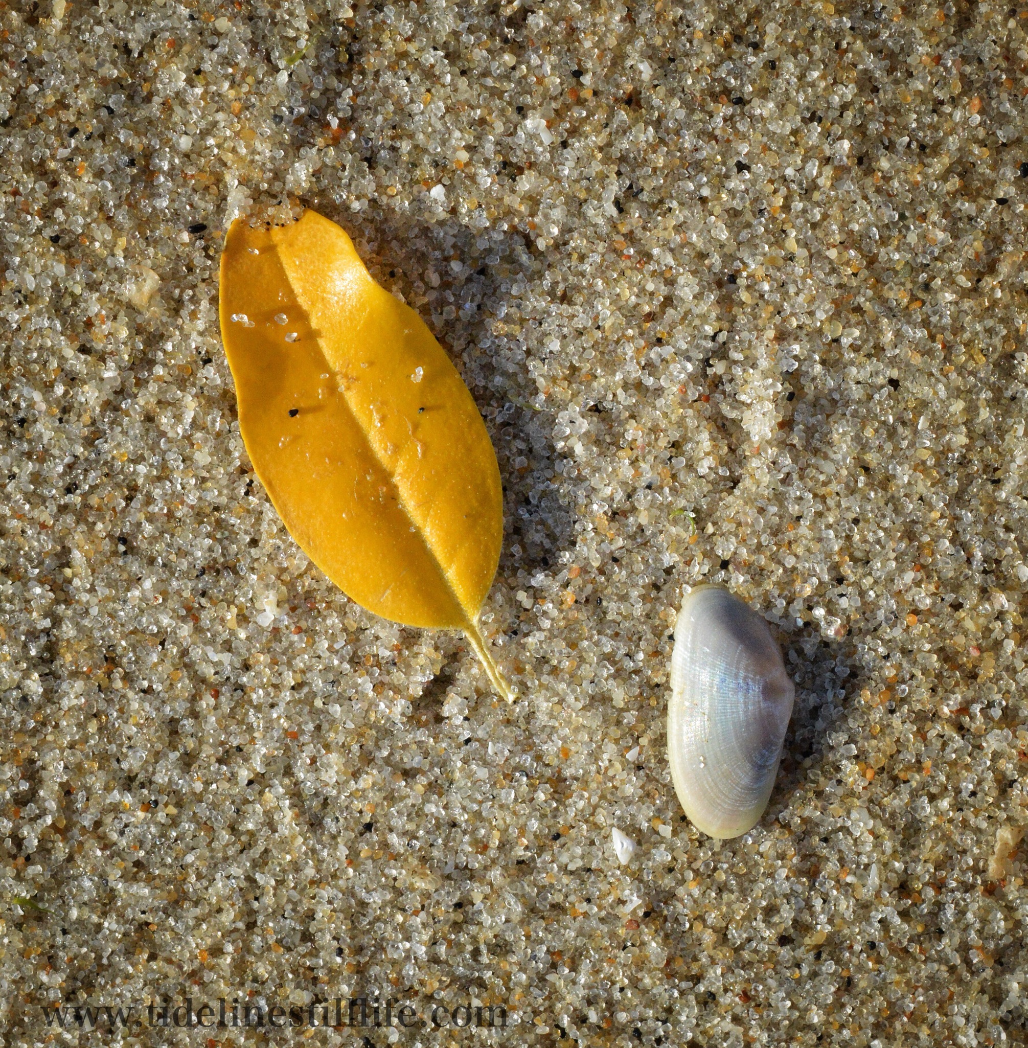 Tagged beach, bright, coquina, leaf, nature, nature photography, New Jersey, ocean, sand, Spring Lake, still life, sun, sunshiney, tide line, yellow