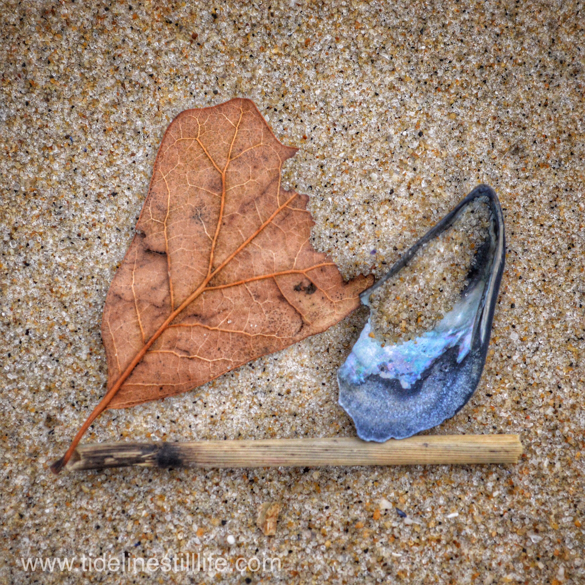 Tagged balance, beach, leaf, New Jersey, ocean, point, sand, shell, Spring Lake, still life, tide line
