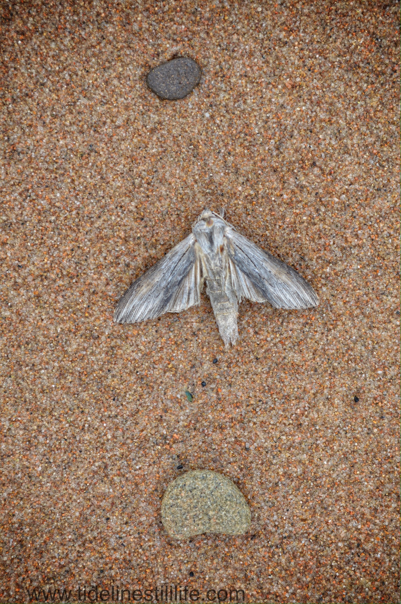 Still Life with Mussel, Moth, and Tide Line Posted on February 24, 2014 by Maggie Beck 0 The high tide has ended leaving in its wake the remnants of two creatures whose lives have ended, too. This is a simple, still beauty.