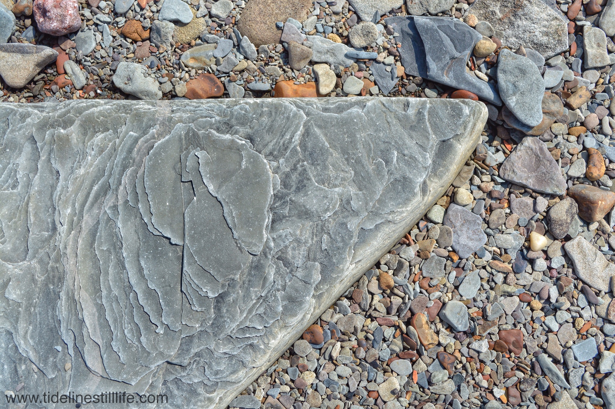 It is a different sort of tide line that presents itself at Joggins Fossil Cliffs, and other pebble beaches. Where I usually look for compositions that prominently include marine life (plant and/or animal) on a sand background, pebble beaches do not offer this sort of tableau. Instead, a pebble-beach tide line is a puzzle of shapes and textures that almost require a refocusing of one’s eye and thoughts before focusing a camera lens.