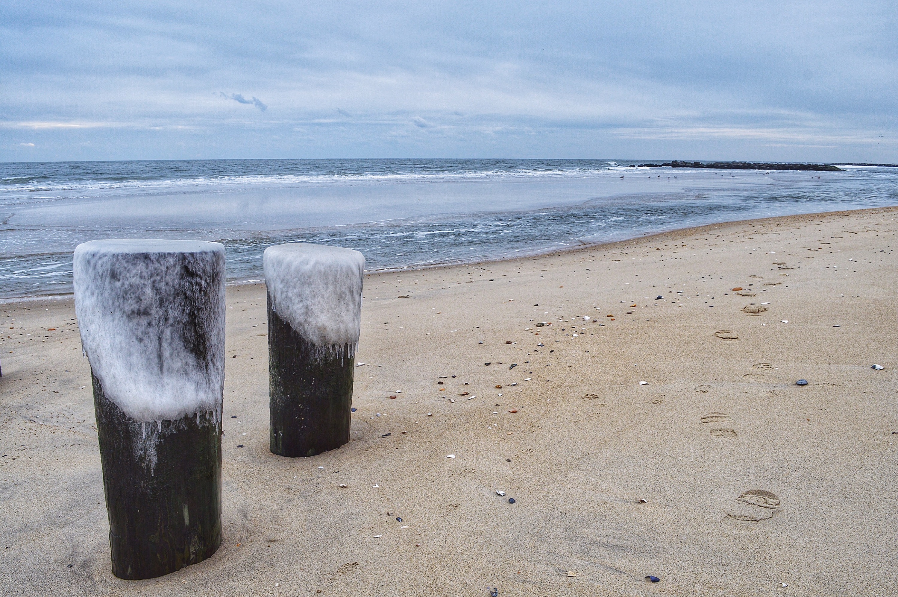 It was really quite cold walking the tide line yesterday, but it was also almost magical. The ocean spray had frozen over the rock jetties and the pilings, and the high tide’s standing water had frozen solid over the sand.
